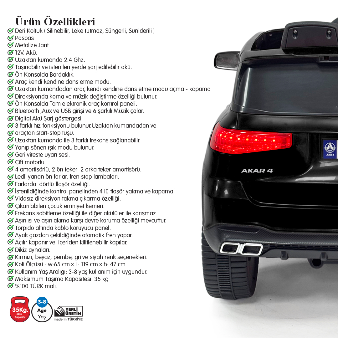 Akar Oyuncak 97-152 Bold GT 12V uzaktan kumandalı akülü çocuk arabası, çocukların keyifli ve güvenli sürüş deneyimi yaşaması için tasarlanmıştır. Siyah rengi, ebeveyn kontrollü uzaktan kumanda sistemi ve ürün sayfasında belirtilen donanım özellikleriyle akülü araba kategorisinde dikkat çekici bir seçenektir.