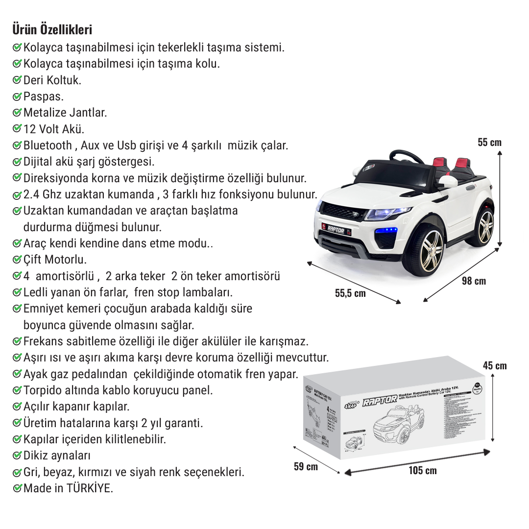 Akar Oyuncak 97-619 Raptor GT 12V uzaktan kumandalı akülü çocuk arabası, çocukların keyifli ve güvenli sürüş deneyimi yaşaması için tasarlanmıştır. Beyaz rengi, ebeveyn kontrollü uzaktan kumanda sistemi ve ürün sayfasında belirtilen donanım özellikleriyle akülü araba kategorisinde dikkat çekici bir seçenektir.