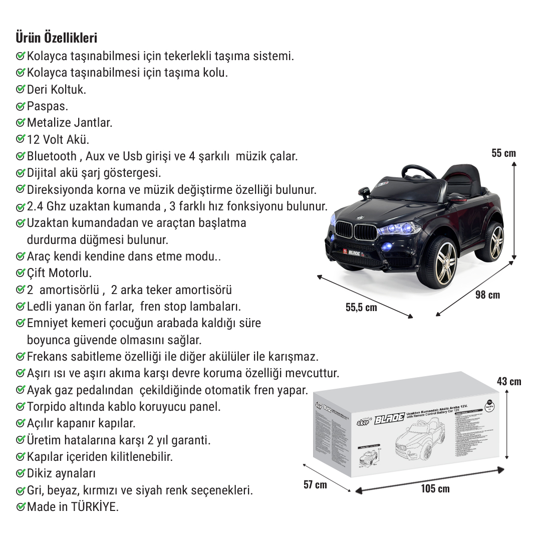 Akar Oyuncak 97-671 Blade GT 12V uzaktan kumandalı akülü çocuk arabası, çocukların keyifli ve güvenli sürüş deneyimi yaşaması için tasarlanmıştır. Siyah rengi, ebeveyn kontrollü uzaktan kumanda sistemi ve ürün sayfasında belirtilen donanım özellikleriyle akülü araba kategorisinde dikkat çekici bir seçenektir.