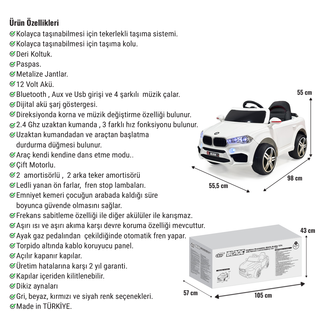 Akar Oyuncak Blade GT 4X2 97-695 | 12V Uzaktan Kumandalı Akülü Çocuk Arabası | Beyaz